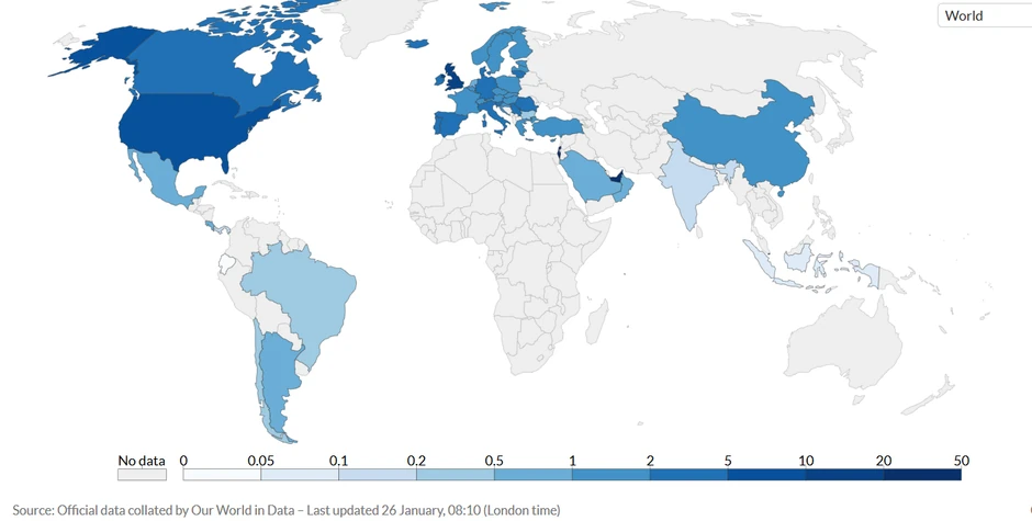 Ako izbor još malo suzimo, dolazimo do brojki za Evropu. Tabela ovih podataka za dan je starija, pa se očekuje da su podaci možda u današnjem danu i bolji nego što ona pokazuje. Naime, ispred naše zemlje, ako je suditi prema podacima pomenutog sajta, nalaze se samo tri zemlje - Ujedinjeno Kraljevstvo, Malta i Island, podaci su za 24. januar. Ipak, to bi moglo da se promeni, jer ako prema svetskim podacima, ispred Srbije je samo Island od evropskih zemalja.