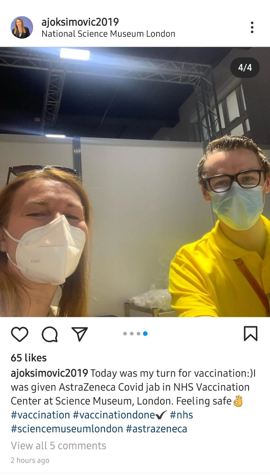 - Danas je bio moj red za vakcinaciju. Primila sam vakcinu "Astra Zeneka" u NHS vakcinalnom centru u muzeju nauke u Londonu. Osećam se bezbedno - napisala je Joksimović.
