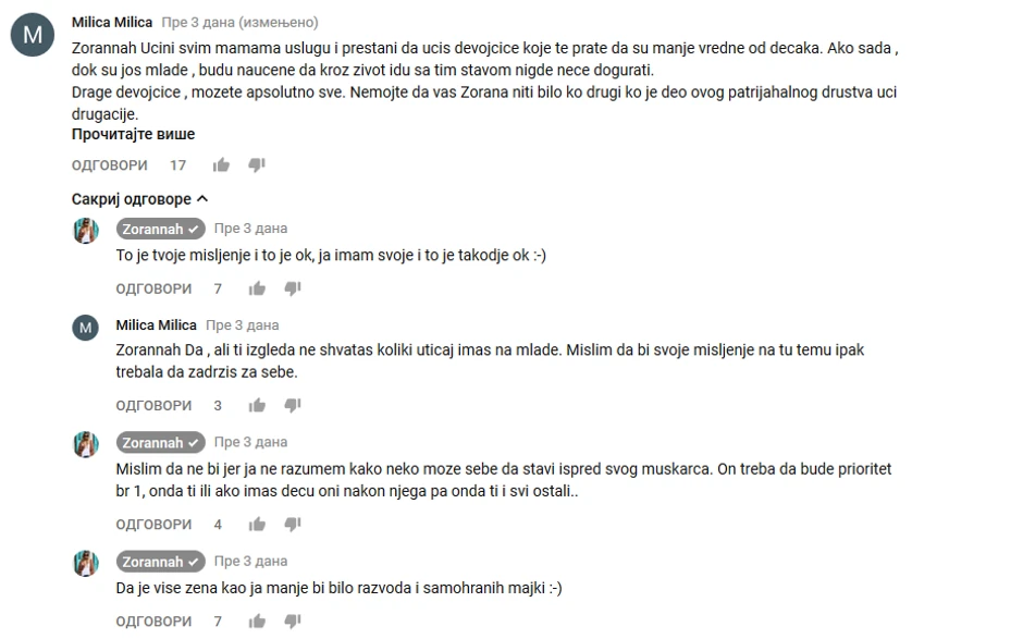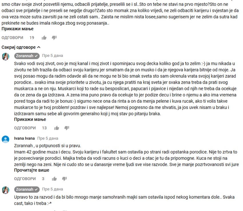 Iako joj opšta kultura nije jača strana, iznenadila je sve i kada je u komentarima na jednim od svojih videa istakla stavove koji položaj žena u društvo vraćaju u ono kakvo je bilo pre sto godina i to upravo onda kada se sa svih strana vode bitke za bolji položaj žena.