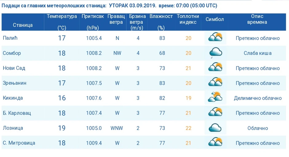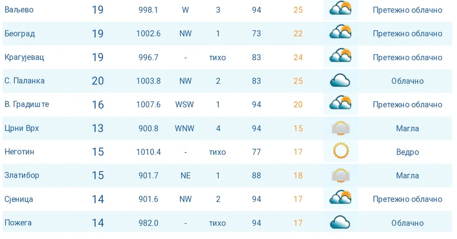 Ujutru i pre podne na severozapadu i zapadu, posle podne u centralnim, a uveče i u toku noći i u ostalim delovima Srbije najavljeno je naoblačenje i osveženje. Vetar slab i umeren, jugoistočni, u skretanju na umeren i jak severozapadni. Istovremeno, najniža temperatura od 8 do 22, a oni koji se raduju eventualnom otopljenju, računa se da će najviša dnevna iznositi od 22 na severozapadu do 32 stepena Celzijusa na istoku i jugoistoku.