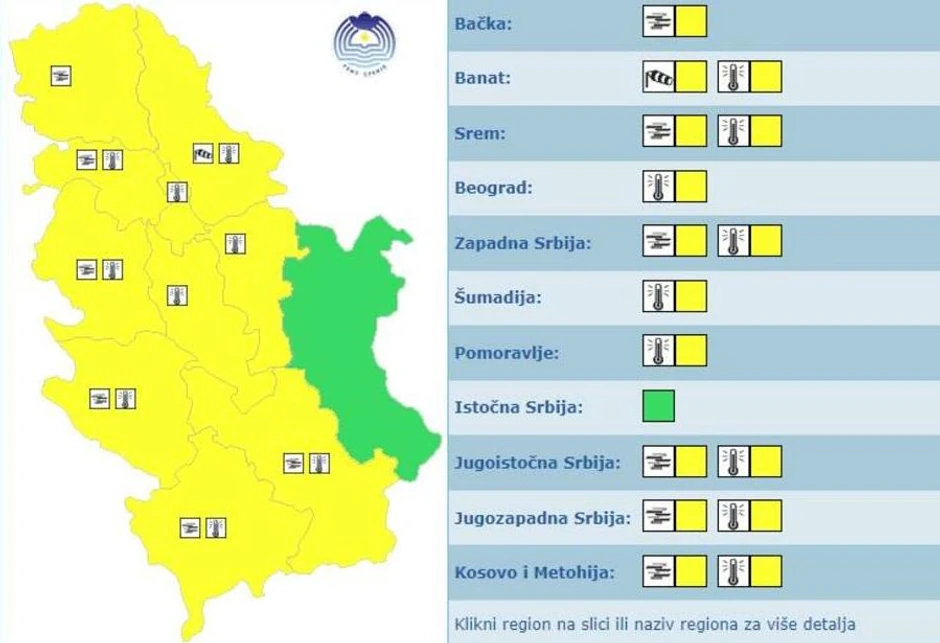 U celoj Srbiji, izuzev istočnog dela, upaljen je žuti meteo alarm. Upozorenje je na snazi zbog magle i visoke temperature, dok je u Banatu potreban oprez zbog olujnog vetra. Žuti meteo alarm znači da vreme može biti potencijalno opasno.