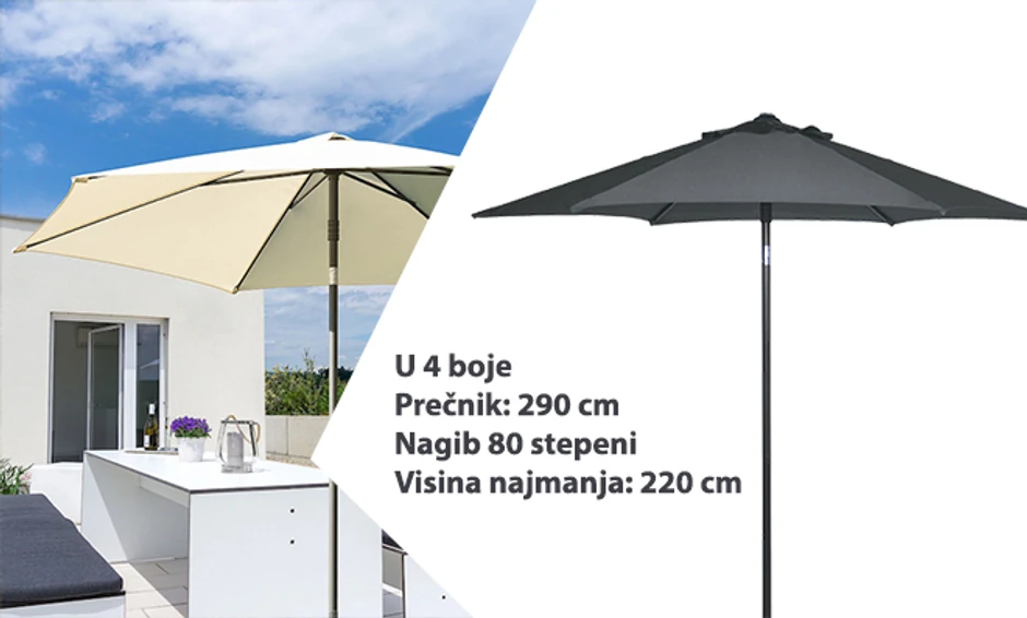 Tu je i Green Lounge Push-up suncobran sa prečnikom od 290cm što ga čini lakim za sklapanje i otvaranje, a isto tako pokriva dosta otvorenog prostora. Ima mogućnost nagiba od 80 stepeni i dostupan je u krem, sivoj, terakote i zelenoj boji. Naručite ovaj idealan suncobran za vašu terasu za samo 5.000 dinara na sajtu gruppi.rs