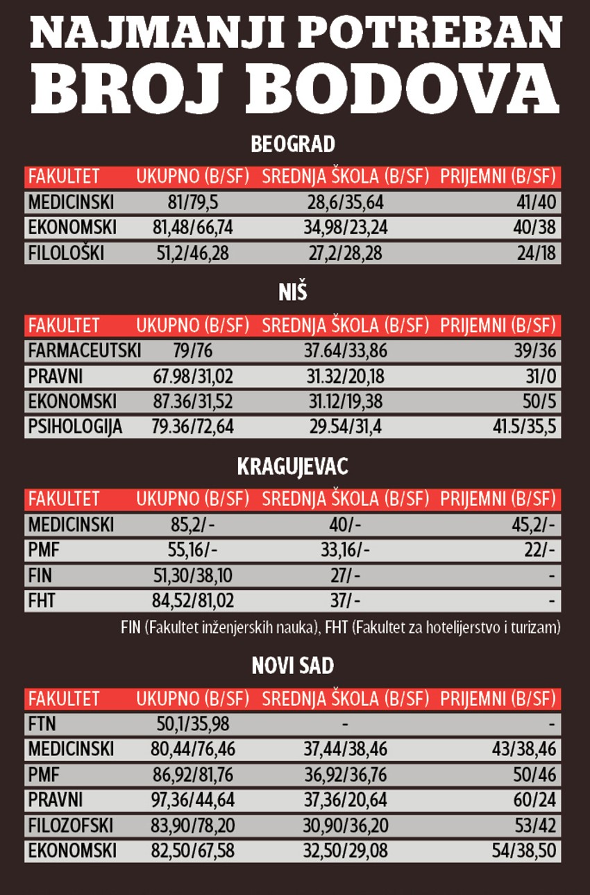 U Kragujevcu su, na primer, prošle godine poslednji na listi na Medicinskom fakultetu iz srednje škole doneli maksimalnih 40 bodova, što znači da su sve četiri godine imali prosek 5,0. Poeni se iz škole računaju tako što se sabere prosečna ocena iz svakog od četiri razreda, pa se pomnoži sa dva.