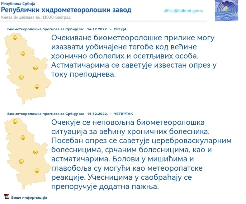 -Očekuje se nepovoljna biometeorološka situacija za većinu hroničnih bolesnika. Poseban oprez se savetuje cerebrovaskularnim bolesnicima, srčanim bolesnicima, kao i astmatičarima. Bolovi u mišićima i glavobolja su mogući kao meteoropatske reakcije. Učesnicima u saobraćaju se preporučuje dodatna pažnja - navodi se na sajtu RHMZ.