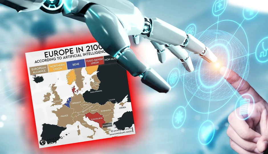 Elem, AI predviđa da će na početku 22. veka, Evropa biti podeljena u nekoliko političkih saveza, dok je u crno „obojila“ teritorije današnje Poljske, Ukrajine i Rusije, Island i države na Iberijskom poluostrvu Španiju i Portugaliju, koje, navodno, neće biti svrstane u neki od ovih alijansi.