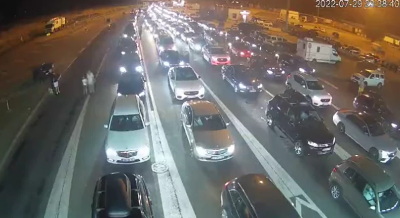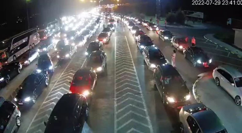 Nije urodilo plodom ni to što je dostupno svih šest traka za ulazak u Srbiju, a ni to što je što je produženo radno vreme prelaza, pa se višesatno zadržavanje putničkih vozila beleži i na izlasku iz Srbije. Ovakva situacija je zabeležena oko jedan sat posle ponoći, jer mnogi kreću na put noću nadajući se da će izbeći gužve i plus 40 stepeni Celzijusa, a ništa bolje ne očekuje se ni jutarnjim satima.