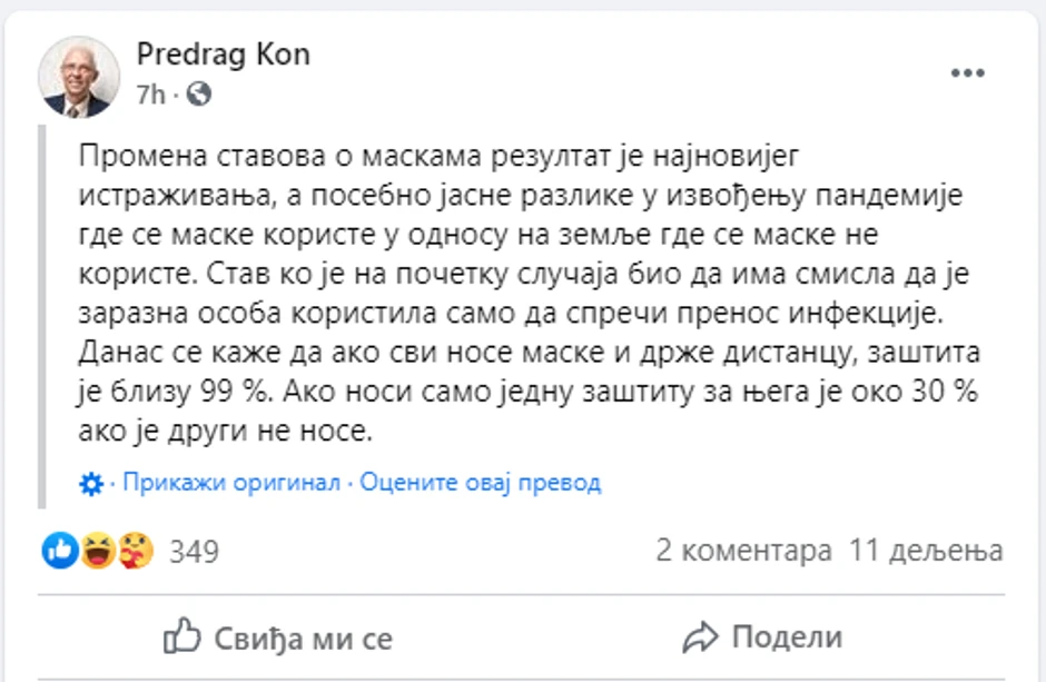 - Menjanje stavova o maskama posledica su najnovijih istraživanja, a posebno nedvosmislenih razlika u uspešnosti suzbijanja pandemije tamo gde se maske masovno koriste u odnosu na zemlje gde se ne koriste. Stav SZO na početku pandemije je bio da ima smisla da masku koristi samo zaražena osoba kako bi sprečila prenos infekcije. Danas se govori da ukoliko svi nose maske i drže distancu zaštita je blizu 99%. Ukoliko nosi samo jedan zaštita za njega je oko 30% ako ostali ne nose - objasnio je Kon.