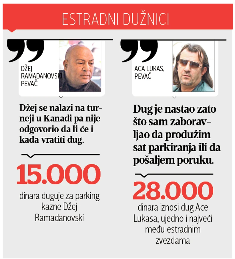 Izgleda da poznatima nisu poznate jedino parking kazne pošto su pevači Vlado Gergiev i Aca Lukas sa čuđenjem dočekali informaciju da imaju dugovanja prema “Parking servisu” u visini nečije plate.