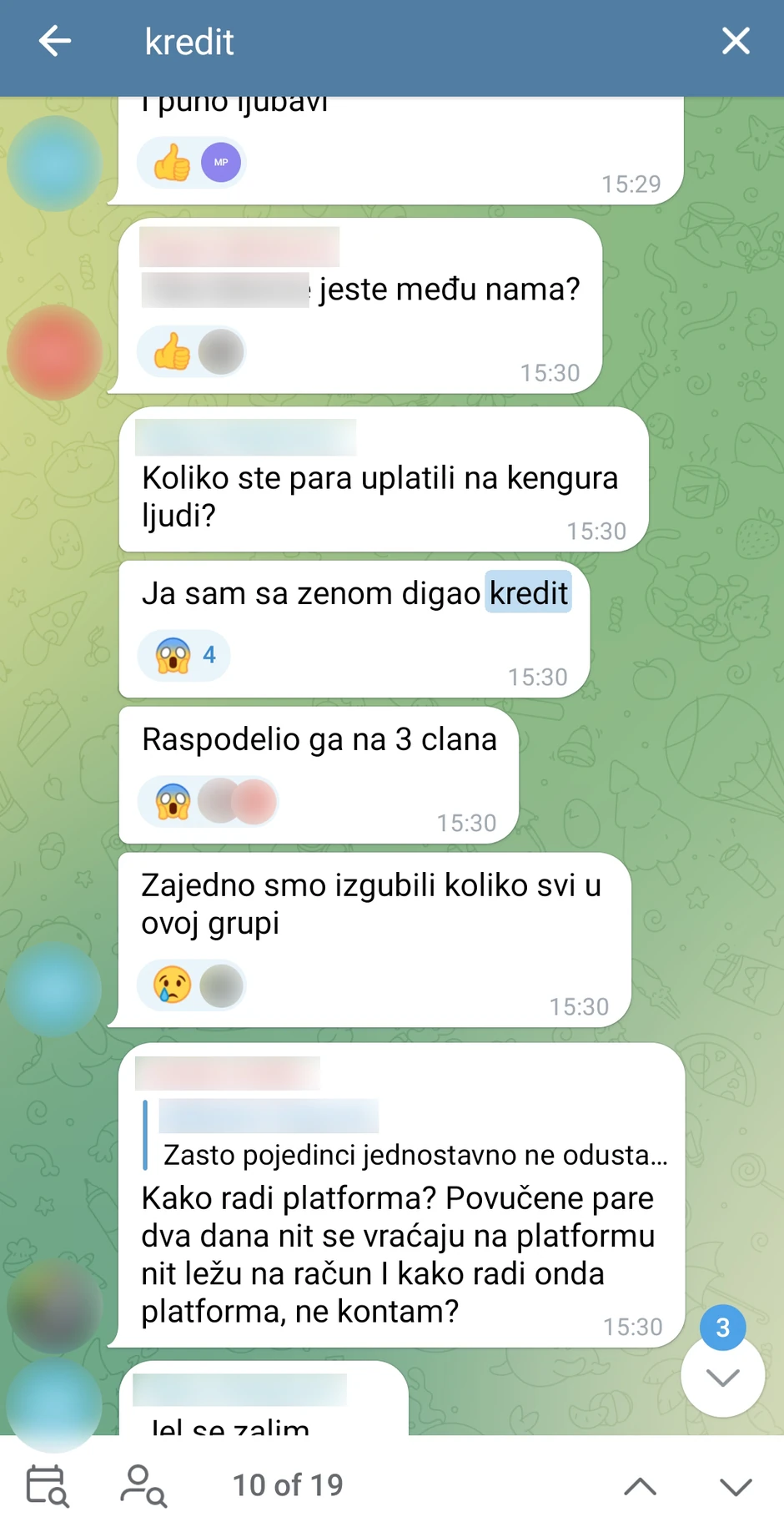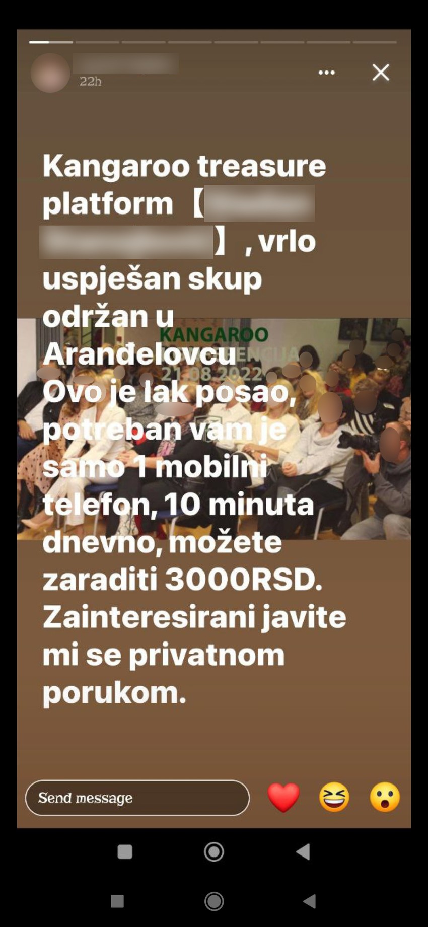 - U Srbiji se dogodila velika pljačka naroda. Grupa kriminalaca plasirala je onlajn platformu za zaradu na internetu pod nazivom "Kangaroo Treasure". Firma je u Srbiji uredno registrovana u APR-u i otvorila računu Rajfajzen banci na koji su ljudi uplaćivali novac. Preko Telegram grupa i društvenih mreža su uvodili nove članove kojima su obećavali sigurnu zaradu potkrepljujući to činjenicom da su sklopili ugovor sa pomenutom bankom na 3 godine. Ljudi su masovno ulagali novac na dinarske račune te firme. Oni su bukvalno preko noći nestali u ponedeljak, 3.10. ove godine. Prestali je isplaćivanje novca ljudima. Nestali su sa milionima - objašnjava naša sugrađanka koja se putem mejla "Blicu" obratila za pomoć.