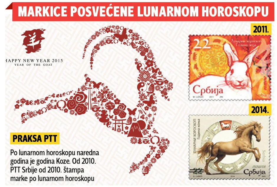 Zapravo, „Pošta Srbije“ od 2010. godine izdaje markice sa simbolima znakova aktuelnog kineskog horoskopa, pa smo imali markice Konja, Zmije, Zmaja, Zeca i Tigra. Serija s horoskopskim motivima jedna je od 17 markica čije je izdavanje u narednoj godini odobreno pravilnikom koji će se primenjivati od 1. januara 2015. godine.