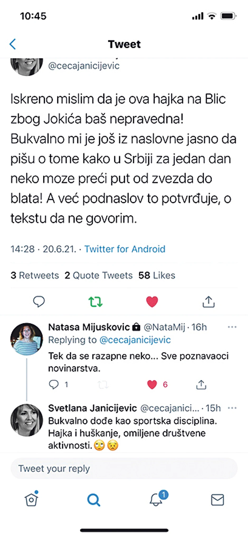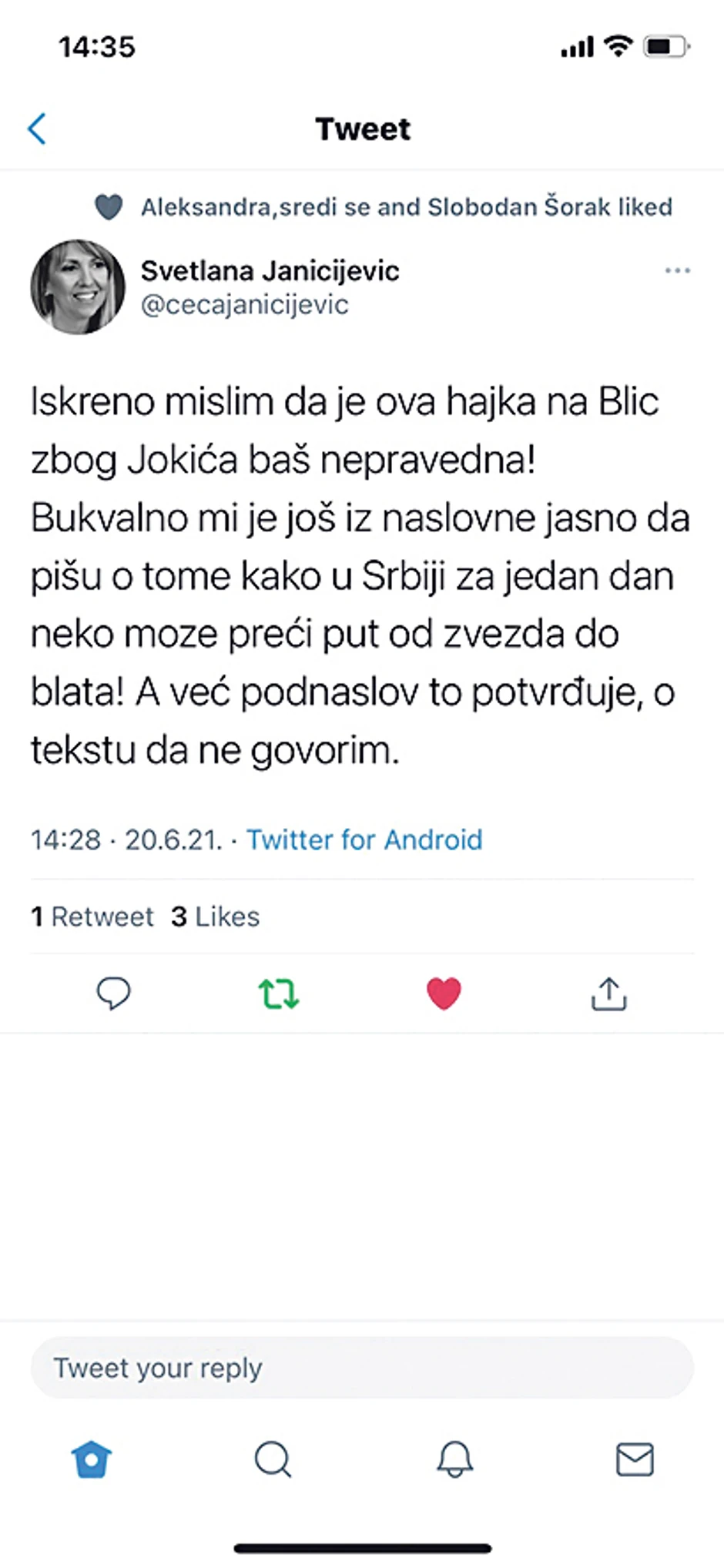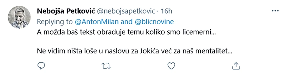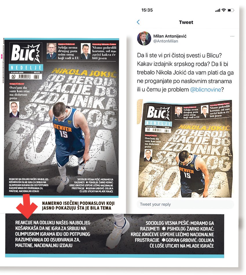 Pravnik iz Beograda Milan Antonijević objavio je u nedelju tvit sledeće sadržine: "Da li ste vi pri čistoj svesti u Blicu? Kakav izdajnik srpskog roda? Da li bi trebalo Nikola Jokić da vam plati da ga ne proganjate po naslovnim stranama ili u čemu je problem?".