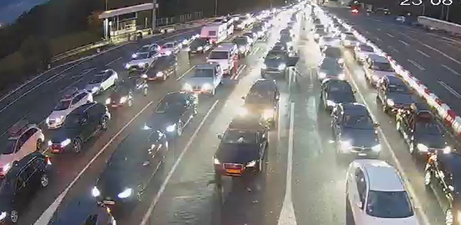 Na kamerama se mogu videti duge kolone automobila, a nervozni putnici izlaze iz svojih vozila i šetaju pored puta.