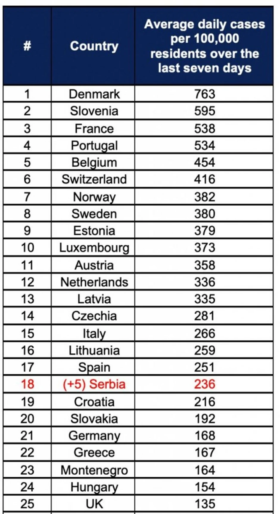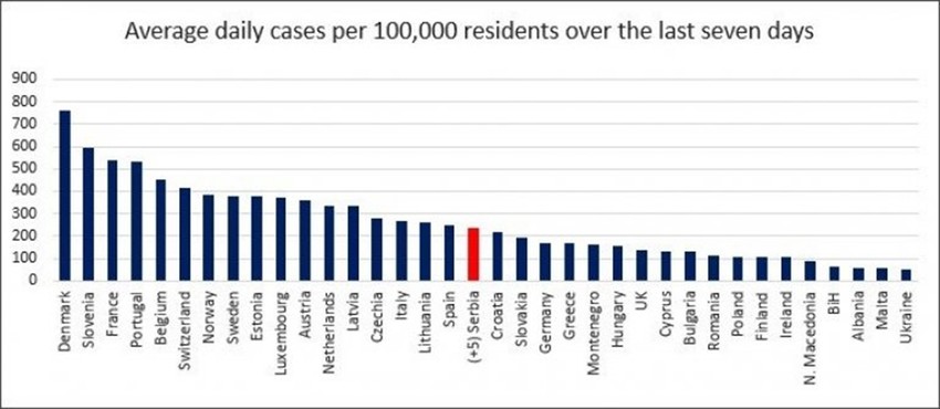 Iako Srbija poslednjih dana dnevno beleži veliki broj zaraženih korona virusom, usled pojave soja omikron koji se brže, kako lekari kažu, širi, dobra vest je da se, u odnosu na druge evropske zemlje, kotiramo bolje nego prošle nedelje.