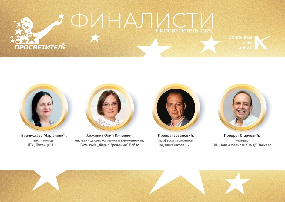 Od oko 200 nominovanih i prijavljenih kandidata za najboljeg nastavnika Srbije na konkursu „Prosvetitelj“ Fondacije „Alek Kavčić“ stručni žiri je od 12 polufinalista izabrao četvoro finalista.