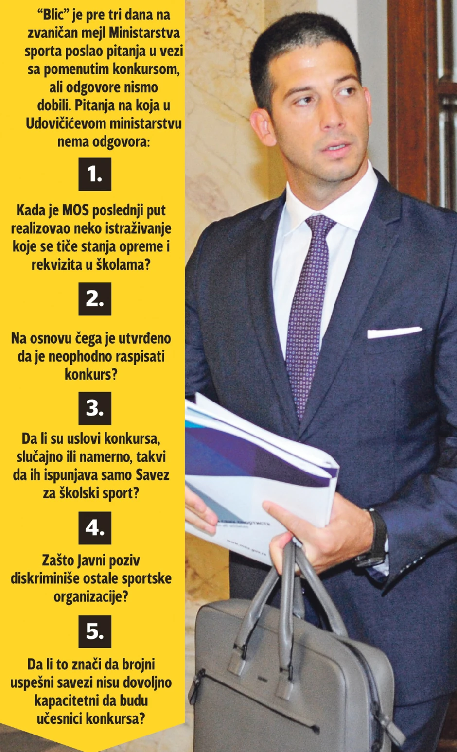 - Konkurs je raspisan tako da uslove ispunjava samo jedna nacionalna sportska organizacija - Savez za školski sport Srbije. Tako se praktično diskriminišu sve ostale nacionalne organizacije i udruženja. Opravdano se postavlja pitanje da li su po sredi zloupotrebe, jer je ipak reč o velikoj količini novca - navodi izvor “Blica” iz Ministarstva sporta.