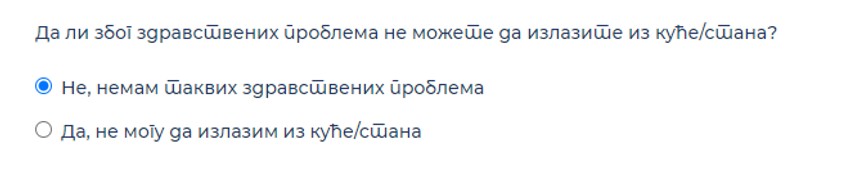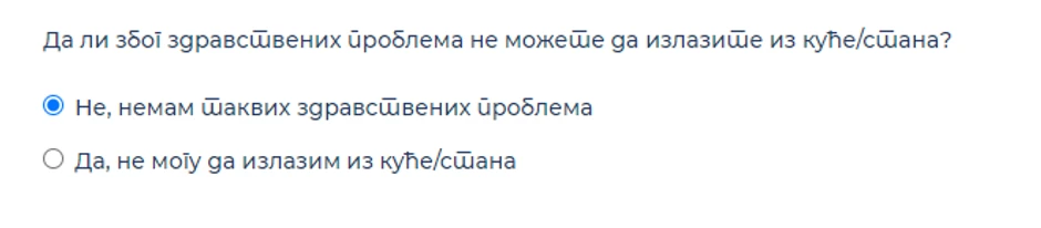 8. Treće pitanje je da li zbog zdravstvenih problema ne možete da izlazite iz kuće. Kliknite na jednu od ponuđenih opcija - "da" ili "ne".