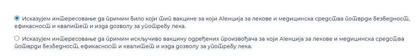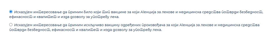 Ukoliko kliknete da ste zainteresovani za vakcinu određenog proizvođača nudi vam se pet opcija, a treba da obeležite željene (možete jednu, dve, tri, četiri ili svih pet).