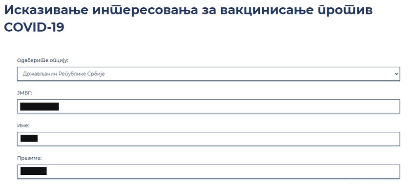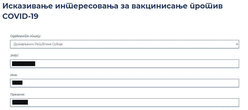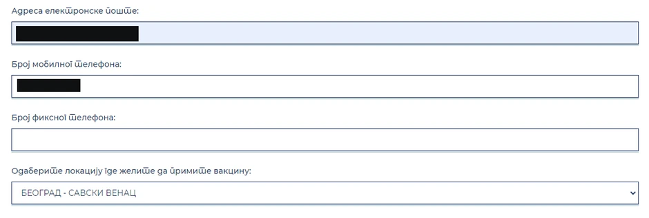 Dakle, popunjavate da li ste državljanin Srbije, matični broj, ime i prezime, adresu elektronske pošte, broj mobilnog i fiksnog telefona, a zatim odaberete opštinu gde želite da primite vakcinu.
