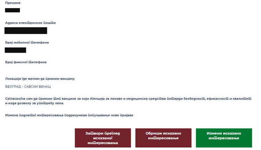 Na taj način možete da obrišete iskazano interesovanje, ili da izmenite podneti zahtev, što podrazumeva popunjavanje nove prijave. Takođe, jasno je naznačeno da u svakom trenutku svoje iskazano interesovanje možete da promenite ili obrišete. To je važna informacija za sve građane koji žele da izmene neki od podataka koji su ostavili.