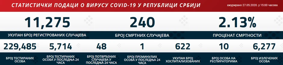 U Srbiji je tako od početka epidemije zaraženo ukupno 11.275 osoba, a preminulo je 240.