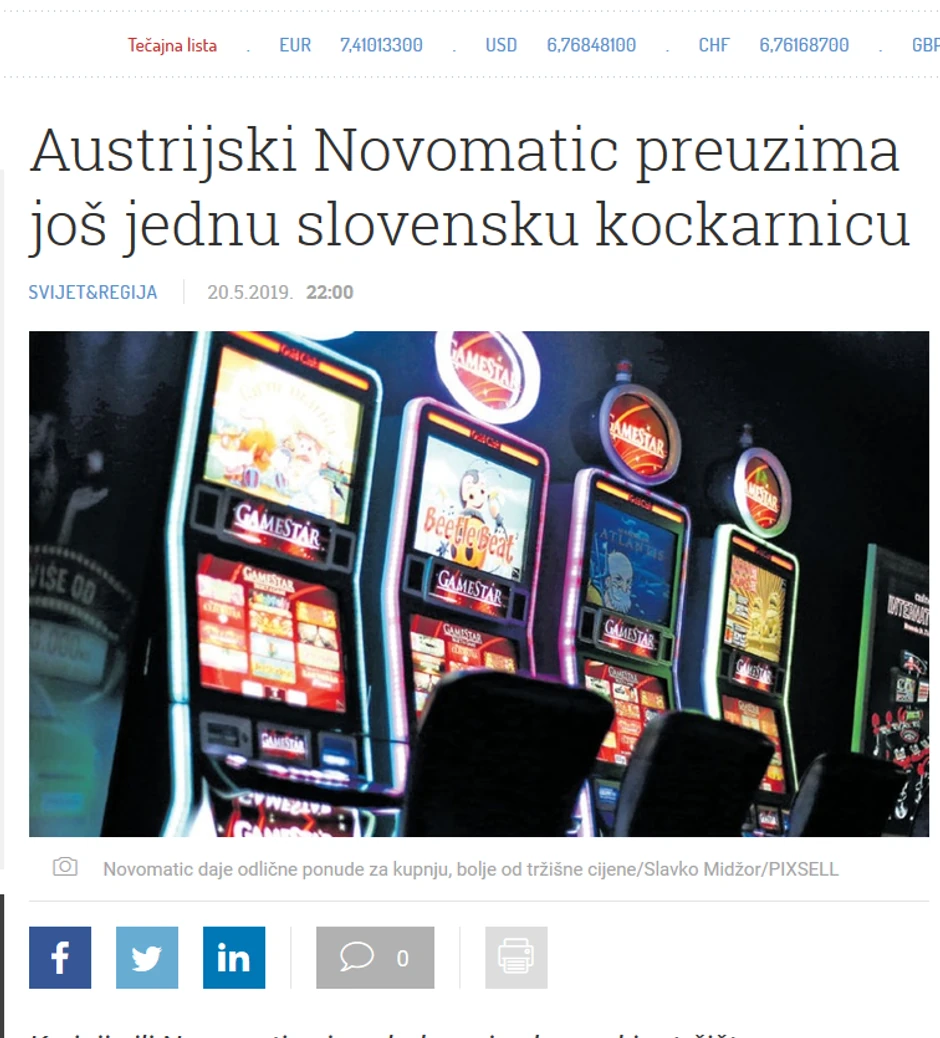 Rešenost "Novomatika" da osvoji region ilustruje i aktivnost njegovih vlasnika u Sloveniji, gde je ova kompanija ušla pre 10 godina, od kad ponude za kupovinu šalje svim priređivačima igara na sreću. Graf je 2018. postao vlasnik već sedme slovenačke kockarnice, pa poseduje više od četvrtine svih salona s koncesijom, od kojih prihoduje 22 miliona evra godišnje. Prema izvorima iz industrije, "Novomatik" je i nadomak sklapanja ugovora o kupovini "Casino Princess" u Novoj Gorici, koji poslednjih godina trpi gubitke, što se uklapa u Grafovu strategiju kupovine onih u lošem finansijskom položaju i objašnjava lakoću preuzimanja balkanske industrije.