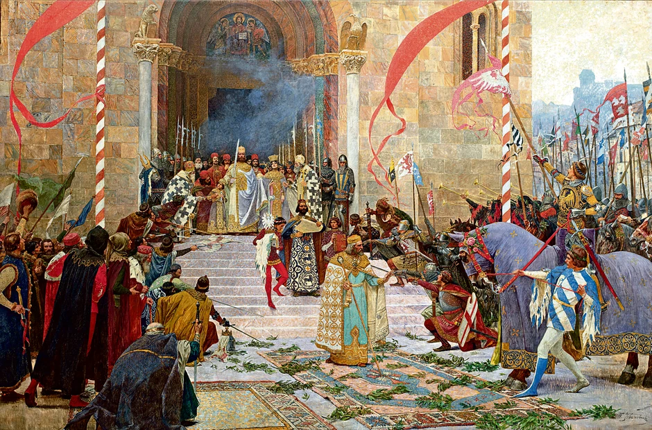Kompozicija veličine više od dvadeset kvadratnih metara sa temom koja prikazuje čin krunisanja cara Dušana u Skoplju 1346. godine, naslikana je kao porudžbina Kraljevine Srbije za potrebe učešća na Svetskoj izložbi u Parizu 1900. godine.