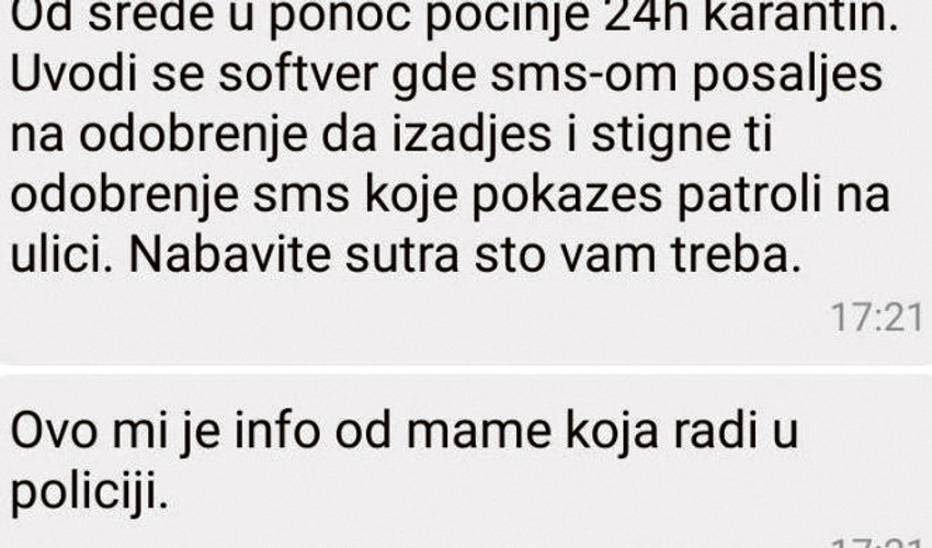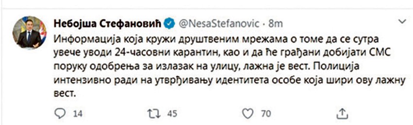 Slična procedura čeka i V. P. (34) iz Beograda, koji je ove nedelje priveden zbog sumnje da je širio paniku tako što je na Tviteru objavio lažnu vest o uvođenju policijskog časa od 24 sata u Srbiji. I njemu je određeno zadržavanje do 48 časova i on će, uz krivičnu prijavu, biti priveden Višem javnom tužilaštvu u Beogradu.