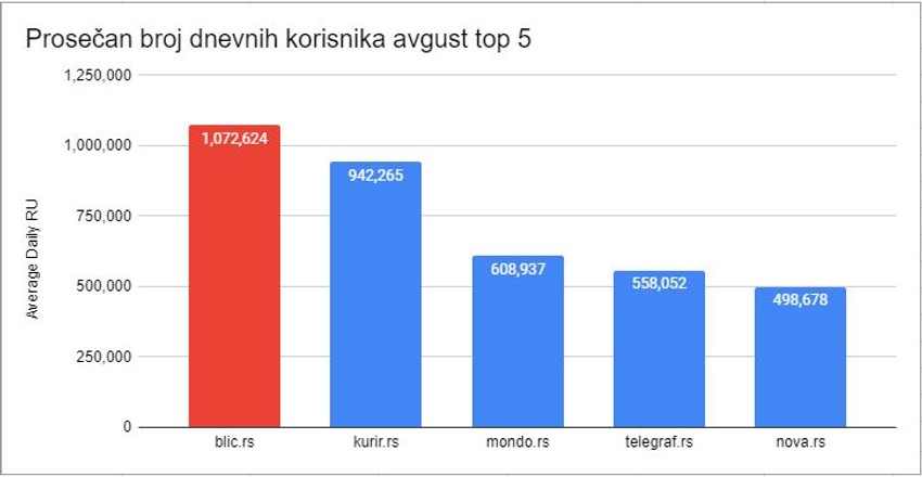 Tako je Blic.rs i 127. mesec uzastopno najposećeniji sajt u Srbiji. Prema istraživanju Gemiusa, Blic je najbolji sajt u Srbiji u avgustu i po prosečnom broju jedinstvenih korisnika na dnevnom nivou (daily average real users) od 1.072.624.
