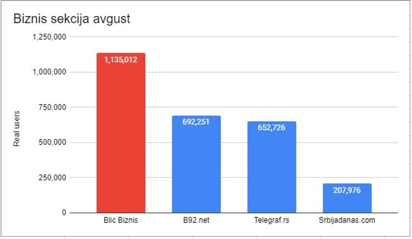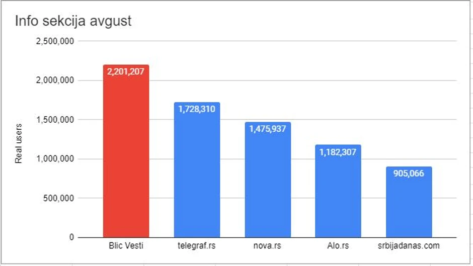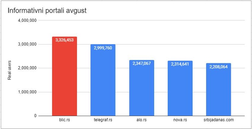 U najvažnijoj kategoriji informativnih portala, u Srbiji je u avgustu najposećeniji bio "Blic", ispred Telegrafa, Alo.rs, Nove i portala Srbijadanas.rs.