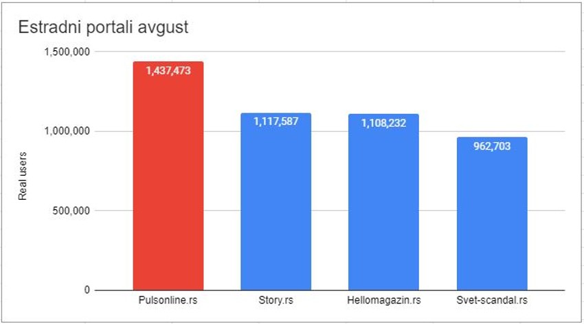 U kategoriji samostalnih portala zabavno-estradnog sadržaja najposećeniji je Pulsonline.rs, sa više od 1,4 miliona jedinstvenih korisnika iz Srbije u avgustu.