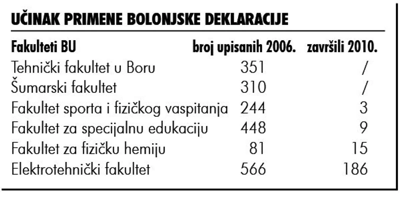 Na Šumarskom fakultetu u Beogradu i Tehnološkom fakultetu u Boru nijedan student koji je 2006. godine upisao studije nije prošle godine diplomirao u roku. Preobimni studijski programi neprilagođeni prosečnom studentu, neodgovarajuća literatura, nemotivisani profesori koji su navikli da budu samo predavači a ne da u nastavu intenzivno uključe i studente, sve su to razlozi zbog kojih bolonjska deklaracija nije dala željene rezultate u Srbiji.