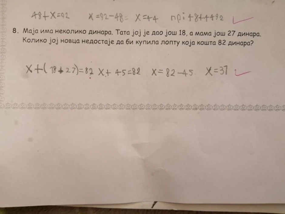Reč je o jednačini sa jednom nepoznatom, koja glasi: "Maja ima nekoliko dinara. Tata joj je dao još 18, a mama još 27 dinara. Koliko joj novca nedostaje da bi kupila loptu koja košta 87 dinara?"