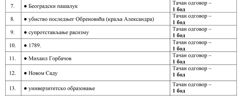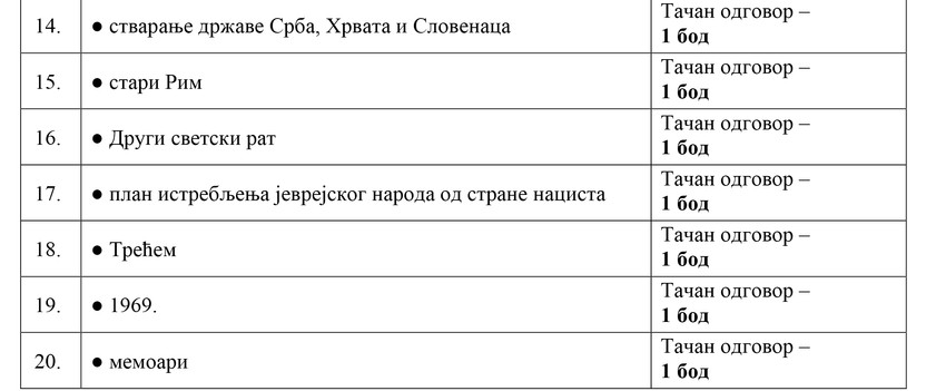 "Blic" objavljuje rešenja testa iz istorije, jednog od pet predmeta koji su đaci danas polagali na maloj maturu. Ove godine ukinut je kombinovani test, a đaci su mogli da biraju koji će od pet predmeta (biologija, geografija, istorija, hemija i fizika) da polažu. U nastavku pogledajte rešenja testa iz istorije: