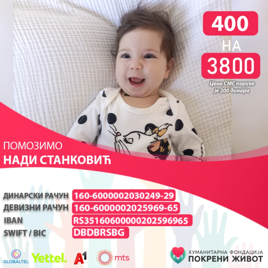 Fondacije „Budi human“ i „Pokrenimo život“ pokrenule su humanitarnu akciju kako bi se Nadi pružila prilika za život dostojan detinjstva. Svaki dinar ide isključivo na njeno lečenje i terapije. I najmanja donacija ima veliku vrednost, 100 dinara kada se udruži sa donacijama drugih ljudi pokriva jednu terapiju, pregled, ili makar nadu.