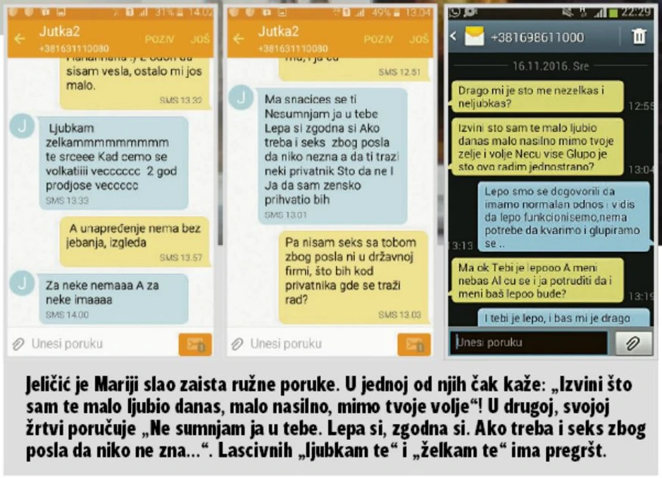 Dalje u prepiskama Jeličić piše kako boljeg od njega neće naći, jer je on najbolji. A na njenu poruku da ne traži muškarca, već da ga je pitala za mogućnost napredovanja u poslu, on odgovara da joj nudi sve, da je obećao, ali da ona ne želi.
