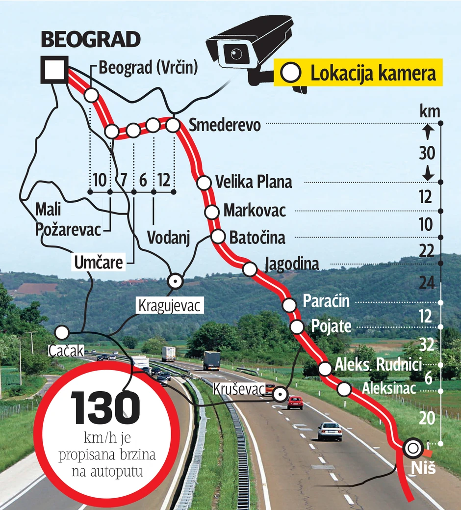Reč je o kamerama koje postavlja JP "Putevi Srbije" u okviru pilot-projekta nadogradnje postojećeg naplatnog sistema na autoputu Beograd-Niš, koji predviđa, između ostalog, postavljanje video nadzora i na deonicama duž kojih nema odmarališta i benzinskih pumpi. Prema tome, vozači koji u proseku voze brže od dozvoljenih 130 na sat, neće moći nikako da izbegnu kaznu osim ako ne prave pauze u zaustavnoj traci.