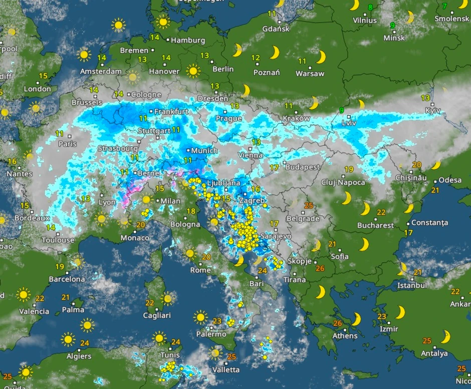 U centralnom delu Mediterana i u oblasti Jadrana zabeležen su jake grmljavinske oluje, u višim delovima Alpa veje sneg, a temperature su ispod 0 stepeni.