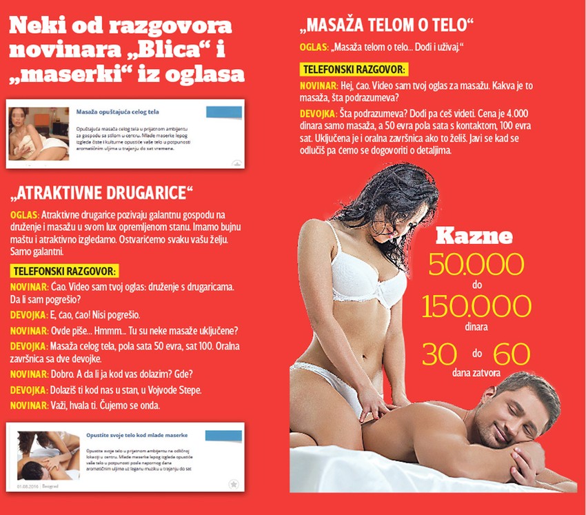 „Opuštajuća masaža“, „relaks masaža celog tela“, „masaža telom o telo“... samo su deo ponuda za masažu na internetu i u štampanim oglasnicima iza kojih se neskriveno nudi prostitucija. U to su se uverili i novinari „Blica“ nakon što su okrenuli nekoliko brojeva postavljenih u pomenutim oglasima.