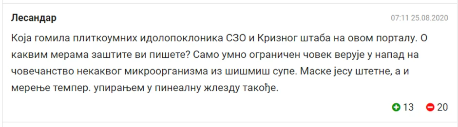 - Koja gomila plitkoumnih idolopoklonika SZO i Kriznog štaba na ovom portalu. O kakvim merama zaštite vi pišete? Samo umno ograničen čovek veruje u napad na čovečanstvo nekakvog mikroorganizma iz šišmiš supe. Maske jesu štetne, a i merenje temperature upiranjem u pinealnu žlezdu takođe - piše drugi antimasker o štetnosti beskontaktnog toplomera uperenog u čelo deteta.