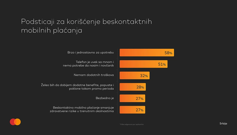 Kao glavnu prednost beskontaktnih plaćanja, MasterIndex ispitanici ističu da su ona brža i jednostavnija od drugih platnih metoda (58%), a ukazali su i na više aspekata njihove sigurnosti – počevši od toga da kartica / telefon sve vreme ostaje u ruci korisnika (51%), preko sigurnosnih tehnologija koje su primenjene (27%) do činjenice da beskontaktna plaćanja smanjuju zdravstvene rizike (27%).