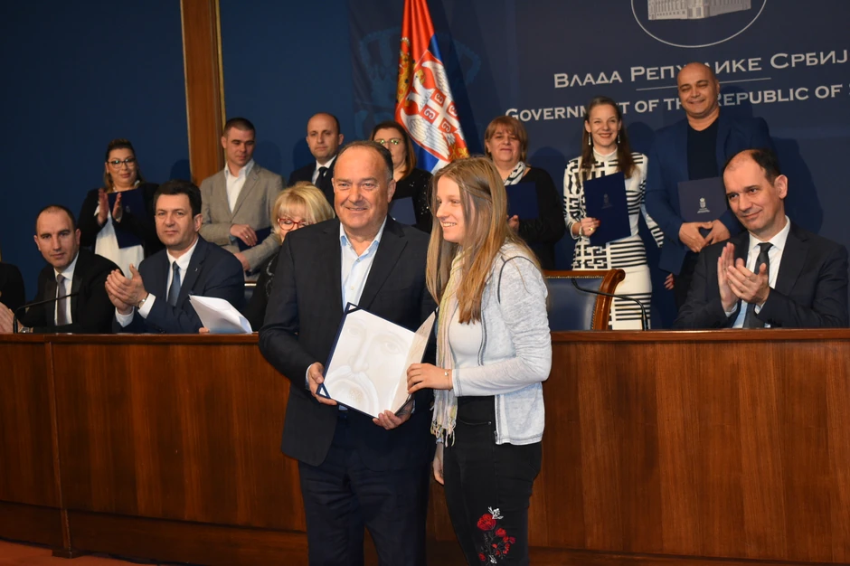 Ministar prosvete, nauke i tehnološkog razvoja Mladen Šarčević uručio je danas u Vladi Srbije tradicionalne Svetosavske nagrade za izuzetne rezultate u oblasti obrazovanja i vaspitanja za 2019. godinu.