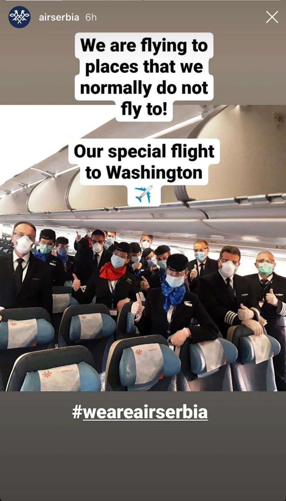 Avion sa našim ljudima iz Amerike stiže sutra, u ranim jutarnjim časovima, a posada "Er Srbije" poručuje sa oficijelnog Instagram profila nacioalnog avio-prevoznika: "Letimo na mesta na koja inače ne letimo. Naš poseban let za Vašington - Mi smo Er Srbija" .