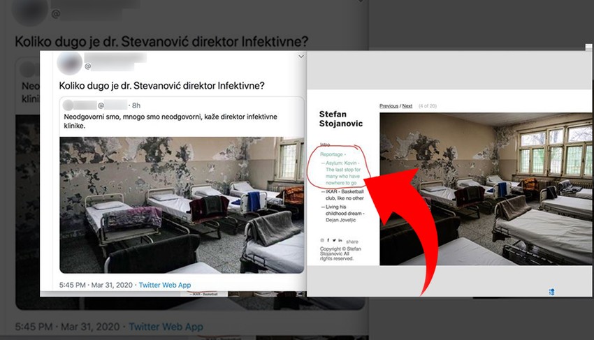 Svet se bori sa virusom COVID-19, ali je ova pandemija dobila svoj pandan i u sferi informacija pa se zbog količine lažnih vesti koje kruže mrežama sve češće govori da imamo posla i sa pandemijom, ali i sa infodemijom. Odličan primer je slika oronulog zida koja je navodno potekla iz Infektivne klinike, ali, kako na svojoj Fejsbuk stranici tvrdi Biljana Srbljanović, zapravo s njom nema nikakve veze.
