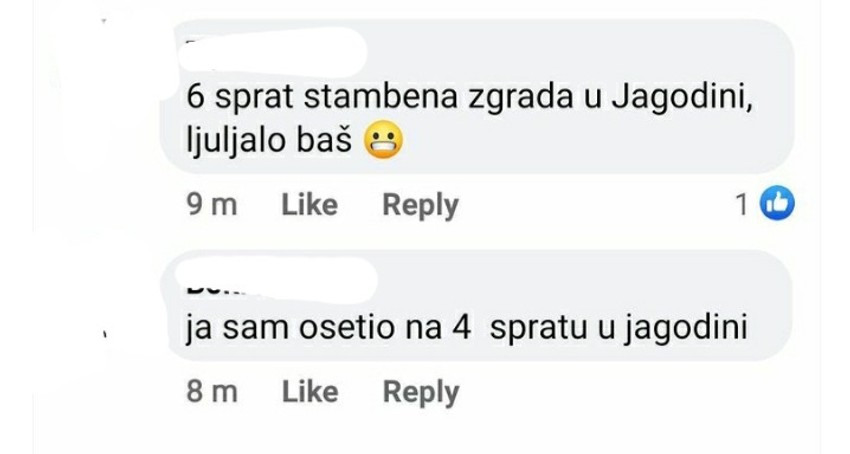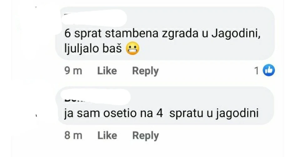 Žitelji Jagodine na društvenim mrežama objašnjavaju da su potres osetili na četvrtom, kao i na šestom spratu stambenih zgrada.
