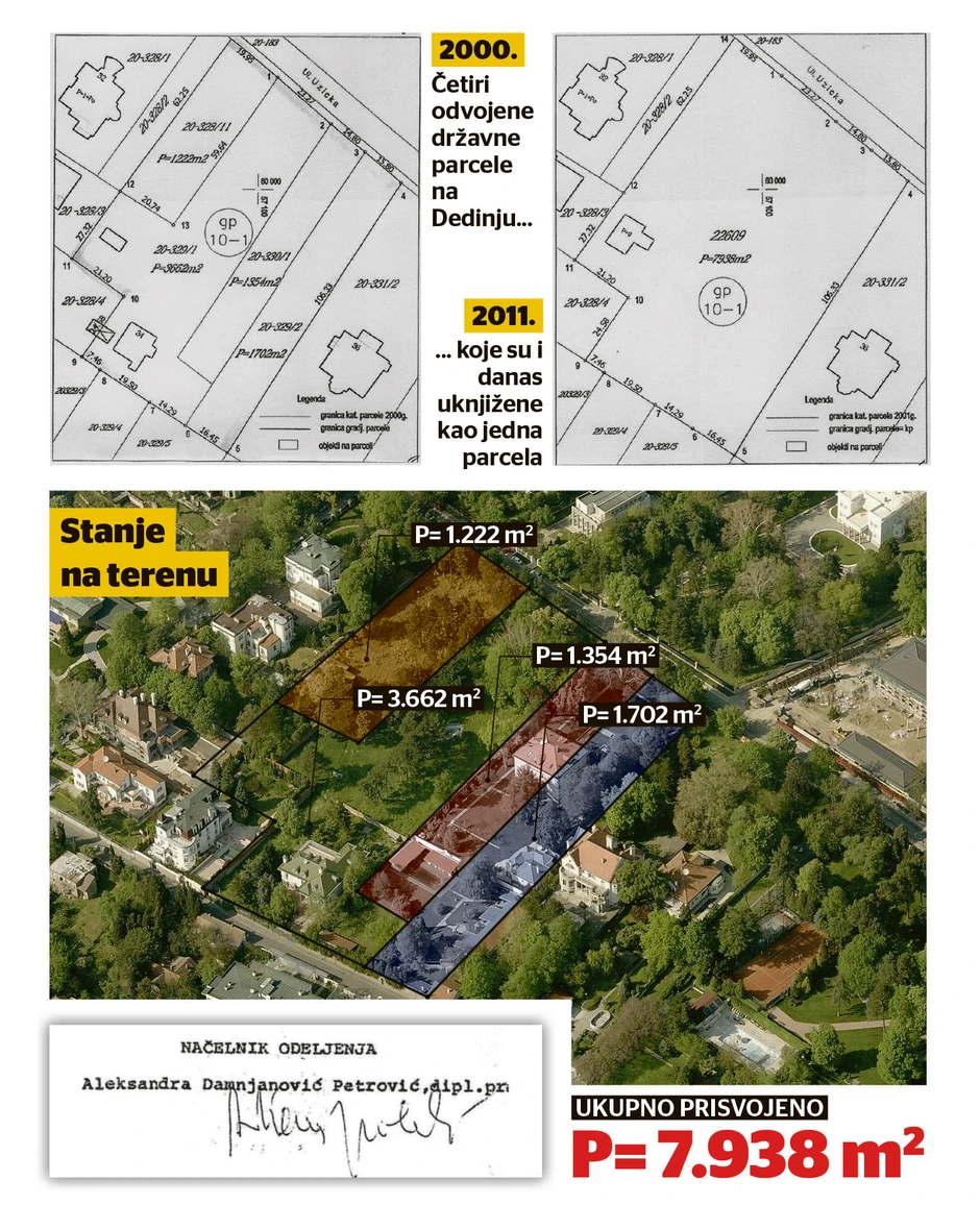 Rešenje o spajanju četiri državne parcele na Dedinju u jednu oko vile u Užičkoj 34, koju je otkupio Milošević, donela je 4. maja 2000. Aleksandra Damjanović tadašnja načelnica Odeljenja za imovinsko-pravne i građevinske poslove Savskog venca. Damjanovićeva je sada državna sekretarka u Ministarstvu građevine, a od 2004, kada je prestala da radi u opštini, bila je pomoćnik ministara za kapitalne investicije, infrastrukture, za prostorno planiranje i urbanizam... i radila je na izradi zakona po čijem tumačenju su Miloševići i dalje vlasnici vile i zemljišta u Užičkoj.