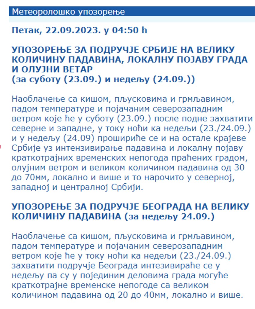 Na osnovu najave Republičkog hidrometeorološkog zavoda Srbije (RHMZ) da se na području Srbije tokom vikenda očekuju jake vremenske nepogode koje mogu prouzrokovati poplave, Sektor za vanredne situacije MUP-a prosledio je nadležnim štabovima za vanredne situacije upozorenje za preduzimanje preventivnih i operativnih mera u cilju sprečavanja i otklanjanja posledica vremenskih nepogoda i zaštite života ljudi i imovine.