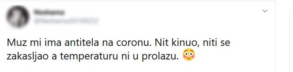 "Muž mi ima antitela na koronu. Nit kinuo, niti se zakašljao, a temperatura ni u prolazu", napisala je ona.
