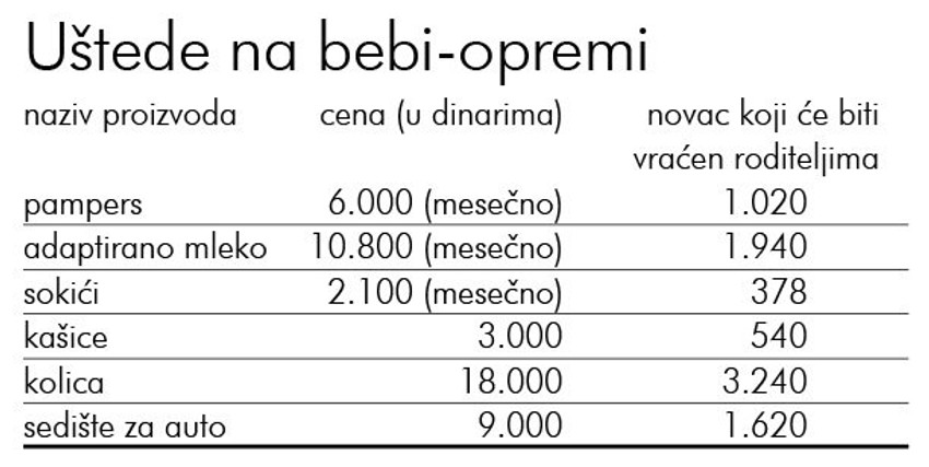 To će konkretno značiti da roditelji i dalje u prodavnicama plaćaju mleko i opremu po istoj ceni, ali da uz sačuvan fiskalni račun odu do najbliže filijale Uprave za trezor Ministarstva finansija, gde će im biti vraćen novac u visini PDV-a, koji iznosi 18 odsto.