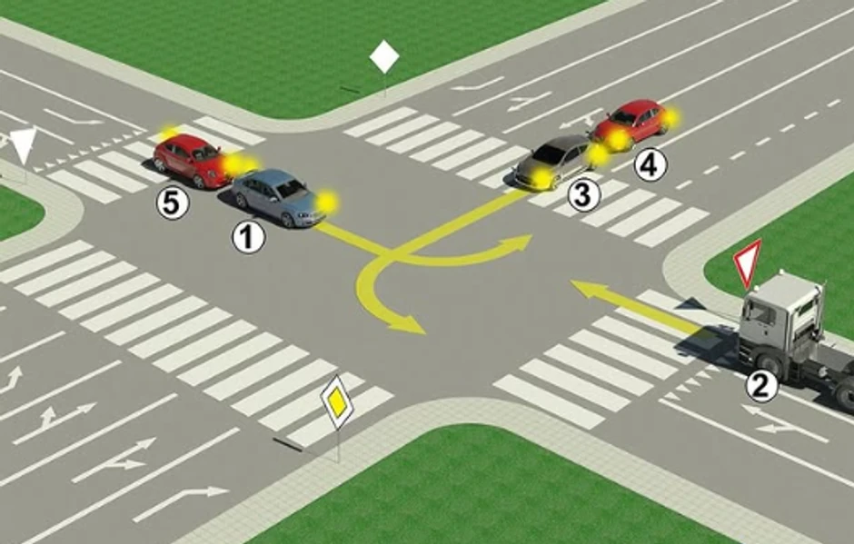Pravilan redosled kretanja vozila na raskrsnici u situaciji sa fotografije: 3, 4, 2, 1 i 5.
