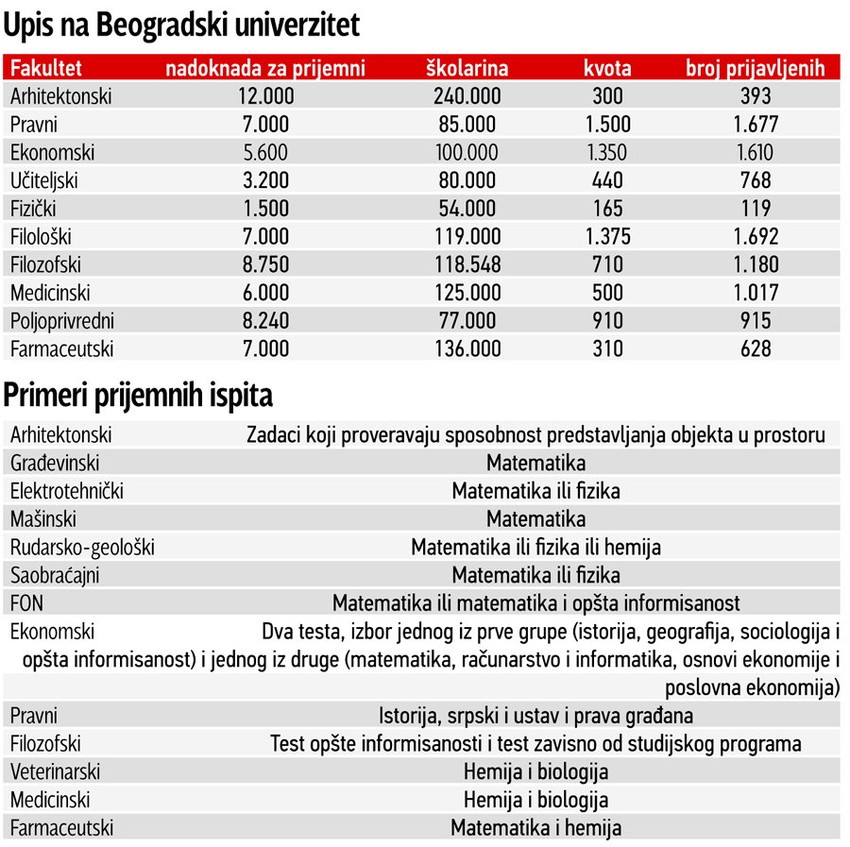 - Interesovanje za pojedine fakultete se preslikava preko tržišta. Zbog ulaganja „Gaspromnjefta“, posle 20 godina Rudarsko-geološki fakultet ispuniće kvotu u prvom upisnom roku, jer imaju odsek za naftu. I dalje vlada veliko interesovanje za ekonomiju i pravo, iako na tržištu rada ima na desetine hiljada nezaposlenih pravnika i ekonomista - kaže prof. Branko Kovačević rektor Beogradskog univerziteta.